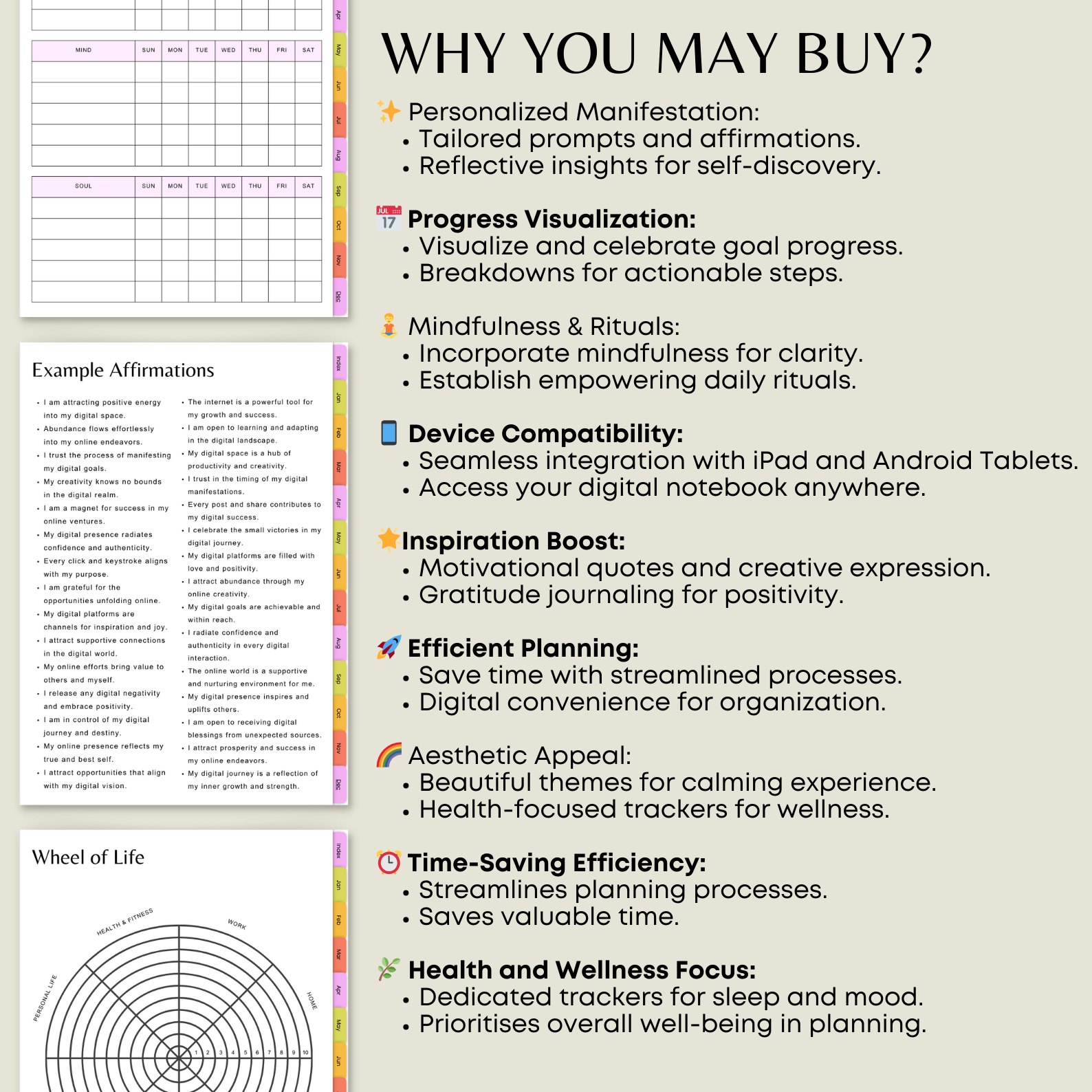 Whether you're navigating challenges, seizing opportunities, or simply seeking direction in daily life, the Digital Manifestation Journal stands as your unwavering ally. With seamlessly integrated daily, weekly, and monthly pages, it empowers you to strategize your goals, manage your time effectively, and foster a profound sense of purpose.