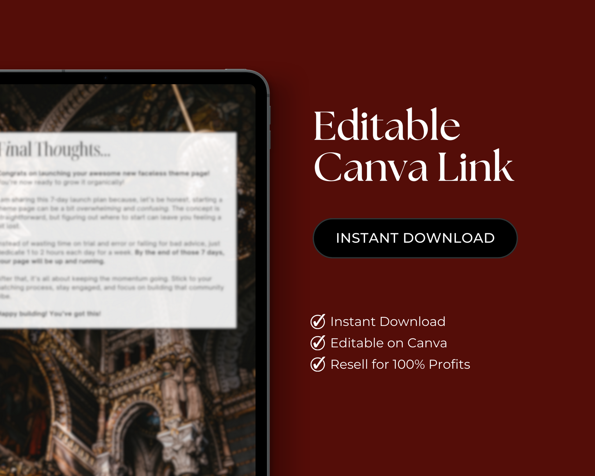 1x PDFÂ with an editable Canva link (works with a free Canva account), allowing you to personalize the guide effortlessly. Add your brand colors, name, and start selling immediately.